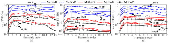 where noise is Gaussian white noise with a mean value of 0. fi is the interharmonic frequency and the values are 48.9 Hz, 51.1 Hz, 52.15 Hz, 65.5 Hz, 103 Hz, 213.4 Hz. φ1, φh and φi are set as random numbers uniformly distributed between (0, 2π). Other parameters are consistent with Section 4.2. Two noise conditions are considered: 40 dB SNR and 60 dB SNR, respectively. Synchrophasor and harmonic phasor detection are performed for signal (27). The maximum TVEs, FEs and RFEs for each method are shown in Figure 6.