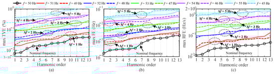 Estimation errors of the 1st to 13th harmonics at different fundamental frequencies (by proposed method). (a) Max TVE (%), (b) max FE (Hz) and (c) max RFE (Hz/s).