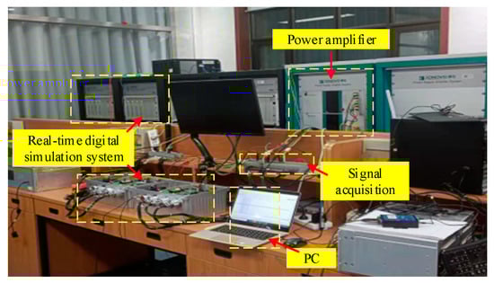 To evaluate the practical value of the proposed method, we built a test platform in laboratory conditions as shown in Figure 9. The experimental signal is first generated using a real-time digital simulation system and further processed by a power amplifier and a signal acquisition device. The sampled data are input to the PC to obtain estimates of harmonic phasors, frequencies and ROCOFs.