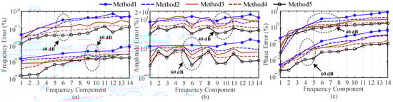 From Figure 10, it is clear that Method 1 cannot obtain estimates of the interharmonics and thus cannot be plotted in Figure 10. Methods 2 to 4 can detect all frequency components. However, since Method 2 uses a series of exponential functions to model the signal, the presence of noise makes the modeling difficult. Since the interference from adjacent frequency components, spectrum leakage and fence effect, the spectral peaks of interharmonics cause severe interference to the spectral peaks of harmonics. Although Methods 3 and 4 use a limited number of data points to obtain derivative estimates of the interharmonic phasors, they cannot restore distorted harmonic phasors, so there are still large errors. In contrast, Method 5 eliminates the interharmonic interference by building an AR model. The parameter estimates of Method 5 are almost the same as the real values even under large environment noise.