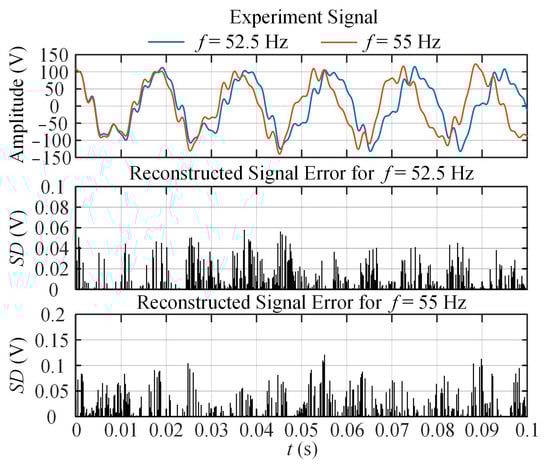 To analyze the situation under frequency deviation, the fundamental frequency is set to 52.5 Hz and 55 Hz, respectively. The signal difference (SD) between the real signal and the reconstructed signal is used as the performance index. SD = |s(t) − sr(t)|, where s(t) is the experimental signal and sr(t) is the reconstructed signal. Figure 11 shows the waveforms of the experimental signals at different fundamental frequencies and the SDs obtained by the proposed method.