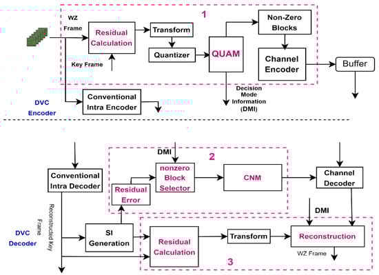 The new features of QUATRID introduced to the DRVC codec are marked in Figure 1 (entitled in dotted boxes 1, 2, and 3).