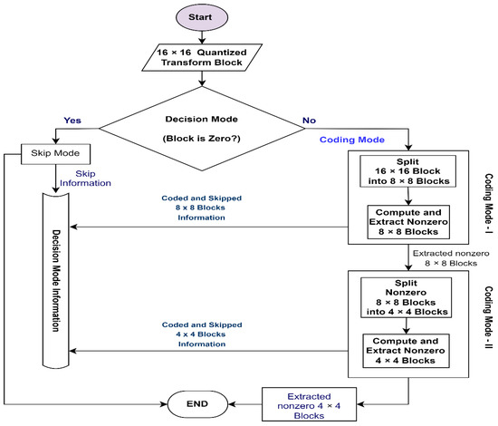 Equation (3) states that if the sum of the absolute of all values of the block Bq16 is zero, then it will be skipped; otherwise, the coding mode will be activated. First, the coding mode-I (CM-I) will be activated in the coding mode process. The CM-I splits Bq16 into 8 × 8 quantized transform blocks (Bq8), where each Bq8 block is tested using Equation (4).