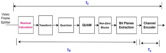 Equation (4) defines that if the sum of the absolute of all coefficients of Bq8 is not equal to zero, it is considered a nonzero block; otherwise, its skipped. The coding mode-I passes nonzero Bq8 blocks to the coding mode-II (CM-II) for further processing. It also passes the code and skipped block information to DMI. In the CM-II process, the nonzero Bq8 is first split into 4 × 4 quantized transform block (Bq4). Then, it analyses each Bq4 to sort out the nonzero Bq4 and notifies the DMI about the coded and skipped blocks. Finally, the nonzero Bq4 blocks are passed for the channel encoding process. The CM-II skips Bq4 if the sum of the absolute of all coefficients of Bq4 is equal to zero; otherwise, it is coded. Mathematically, the CM-II conditions are presented in Equation (5), where m and n determine the position of the quantized transform coefficient in Bq4.