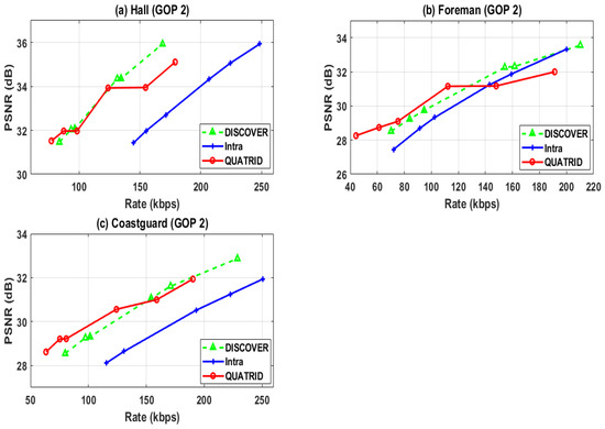Figure 4 shows the RD performance of different video sequences with GOP 2 for DIS, Intra, and QUATRID. Figure 4a shows the RD performance of the Hall video sequence. The graph analysis shows that the QUATRID performance is comparable with DIS for low RD points; however, it outperformed the Intra codec. Further investigation determines that QUATRID performance slightly lagged compared to the DIS for intermediate RD points, but slightly improved over the Intra codec. The RD performance QUATRID at high RD points lagged compared to both DIS and Intra codec. However, close analysis determines that the major advantages of QUATRID achieved throughout all RD points are high coding efficiency, low encoder computational complexity, and less channel coding process. The coding efficiency varies from 6.02 kbps to 7.65 kbps. In addition to this, the QUATRID computational complexity analysis determines low computational complexity for all RD points. Further NBP analysis shows that fewer channel encoded bit planes are utilized for all RD points and can still achieve the comparable PSNR. The analysis is evident that the BPR is up to 84% for the highest RD point. In addition to this, for the same RD point, the CTIRf is more than 5.8 folds, which determines that QUATRID performed 5.8 times faster than QUATRID. Although QUATRID slightly lagged in PSNR gain at some RD points, channel encoding computational complexity was reduced by more than fivefold because the BPR ranged to 84%. Further, QUATRID gains coding efficiency compared to Intra, which varies from 64 to 83 kbps. Despite its modest coding efficiency for Hall video, the main benefit of QUATRID is its lower computational cost for channel encoding compared to the DIS codec. Figure 4b shows the RD performance of the Foreman video sequence. The QUATRID codec at low rate points shows better RD performance than DIS and Intra. It achieved the gain in PSNR. While for intermediate rate points, the QUATRID codec lagged from the DIS. However, it outperforms the Intra. The QUATRID codec PSNR performance marginally degraded for the high rate point from both the DIS and Intra. However, the BPR analysis shows that the QUATRID BPR is up to 78% for such a high rate point. In addition to this, for the same RD point, the CTIRf is more than 3.75 times and goes up to more than five times. In Figure 4, graph (c) shows the RD performance of the Coastguard video sequence. The QUATRID outperforms low rate points and gains up to 0.07 dB PSNR. The QUATRID’s RD performance is comparable with the DIS code for intermediate rate points. In addition to this, it is better from the Intra codec. Comparing the performance at intermediate rate points, QUATRID is comparable to DIS and superior to Intra. However, the QUATRID RD performance slightly lagged from the DIS at high rate points. However, the QUATRID depicts low computational complexity and comparable PSNR gain for Coastguard, as it does for other sequences. The analysis evidenced that the BPR is up to 85% for the highest RD point. Moreover, for the same RD point, the CTIRf is more than five folds, indicating that QUATRID performs 5.38 to 7.59 times faster than the DIS codec.