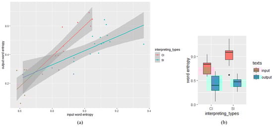 In the sense of information theory, entropy is used to quantify linguistic features in terms of diversity or complexity [,,], and the entropy of words can be seen as the upper bound on expressivity []. This indicator is drawn on to measure the freedom of choice, that is the uncertainty on choosing word categories and words. Our findings signify that CI outputs are more diverse and complicated, and the use of words are more unpredictable as compared to SI outputs, which conforms to the explicitation hypothesis. ‘Explicitation’ was initiated as ‘making explicit in the target language what remains implicit in the source language since it is apparent from either the context or the situation’ []. In CI, the comprehension phase and the reformulation phase are separated. The reformulation phase is not started until the input speech in the source language is fully processed. This enables CI interpreters to have longer time to integrate the message of several sentences in the source language and form an overall understanding of the core point as well as the context. With a macro structure of the source text in mind, CI interpreters can make the renderings more explicit by providing additional information which can be inferred from the context. From the interpreter’s perspective, the motivation of using explicitness in CI may be to fill in the gap arising from information loss. To avoid causing a ‘vacuum of meaning’ for listeners, consecutive interpreters resort to the strategy of explicitation and fill in these gaps with explicit information that is inferable from other contextual information []. From the listener’s perspective, consecutive interpreters have more time for clarifying and explaining the original information to achieve comprehension sufficiency.