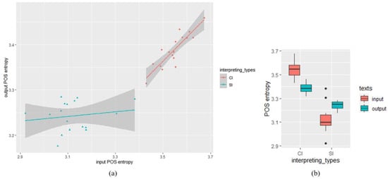 Typically, textual entities are words. In the present study, we adopted both words and part-of-speech (POS) as textual entities for entropy. As claimed by Murphy [], syntactic labeling is the operation which chooses which lexical features select the phrasal category. The label indicates the meaning of the structure to the conceptual-intentional system []. The processes of syntactic category and syntactic labeling are highly related to core lexico-semantic properties of the lexicon, which reveals the uniqueness of the human computational system []. In the setting of interpreting, the diversification of word categories in interpreting texts may be a potential feature distinguishing interpreting type. According to Jia and Liang [], a striking loss of adjectives was found in CI processing compared to SI, suggesting that a lexical category bias exists across interpreting types. Additionally, some quantitative studies demonstrated that word categories of a given language are meaningful in stylistic analysis []. Pan et al. [] compared original poetry texts with their translated versions from the perspective of POS frequency distribution, and discrepancies were observed among different versions of translated works. Similar results were found between traditional poetry and modern poetry []. POS entropy is also investigated to distinguish ‘narrative vs. expository’ text types in both English and Chinese [].