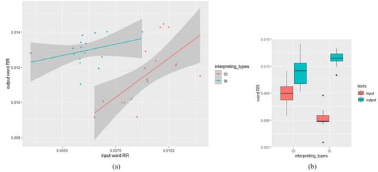 Word RR analysis: (a) scatter plot visualizing the relationship between input and output Word RR in SI and CI (the datapoints indicate word RR of each text); (b) descriptive statistics: input and output Word RR in SI and CI texts.