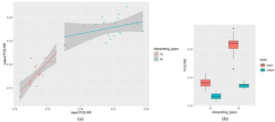 POS RR analysis: (a) scatter plot visualizing the relationship between input and output POS RR in SI and CI (the datapoints indicate POS RR of each text); (b) descriptive statistics: input and output POS RR in SI and CI texts.