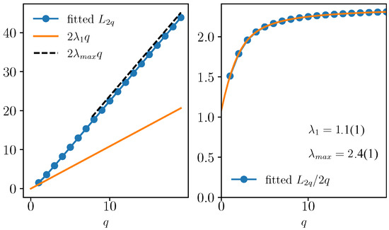 Generalized Lyapunov exponents fitted from Figure 1. (Left) as a function of q, contrasted with the actual Lyapunov exponent and the maximal expanding rate , obtained by a fit of these data at large q. (Right) as a function of the moment q, from which we extract the maximal Lyapunov exponent .