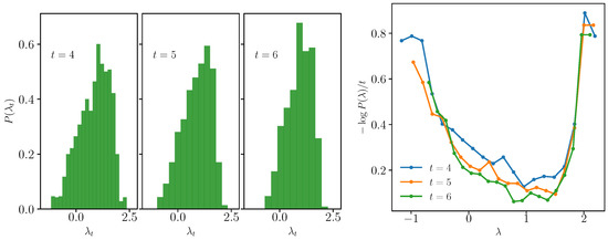 In Figure 4, we show that the local Lyapunov exponents are a large deviation. We consider the coefficients from Figure 3 (we divide everything by a constant factor). On the left, we plot their numerical distribution at different times , which shows that it converges to a distribution at large t. On the right, we plot , which shall correspond to the smooth convex “Cramer” function at large times; see Equation (9).