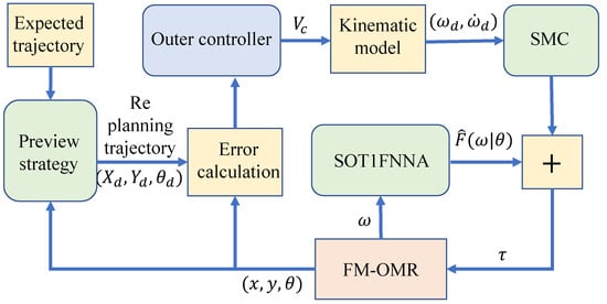 It can be seen from the diagram, after a given desired trajectory, that the system first plans the trajectory according to the preview strategy, then obtains the desired angular velocity based on the position error and the outer loop controller. The inner loop sliding mode controller and SOT1FNNA work together to track the angular speed of the robot and finally achieve the track tracking.