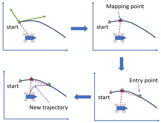 Figure 6 reveals that the preview method consists of four parts. First, judge whether a preview is required according to the method shown in Figure 5, and then map the position of the robot to the trajectory to find the mapping point. Then find the entry point according to the distance between the robot and the mapping point. Finally, the trajectory is re planned according to the position and speed of the entry point. Since the re planned trajectory should be as close to the original trajectory as possible, polynomial interpolation cannot be used for planning.