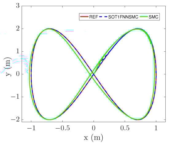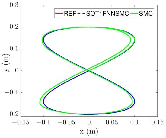 The trajectory tracking results are shown in Figure 8. In the figure, “SMC” represents a common sliding mode controller. “SOT1FNNSMC” is the control scheme proposed in this paper. Figure 8 can clearly indicate that the tracking curve of SOT1FNNSMC is more consistent with the reference trajectory and has better tracking performance.