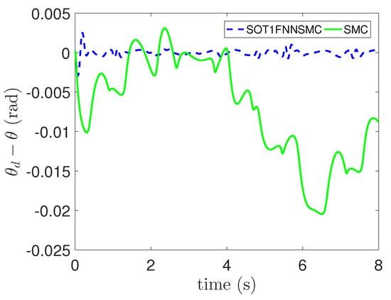 In addition, the errors of each component of trajectory x, y and are respectively shown in Figure 9, Figure 10 and Figure 11. These figures clearly show that the tracking error of SOT1FNNSMC on each component is smaller and more stable than SMC. The results verify that the proposed method has good tracking performance.
