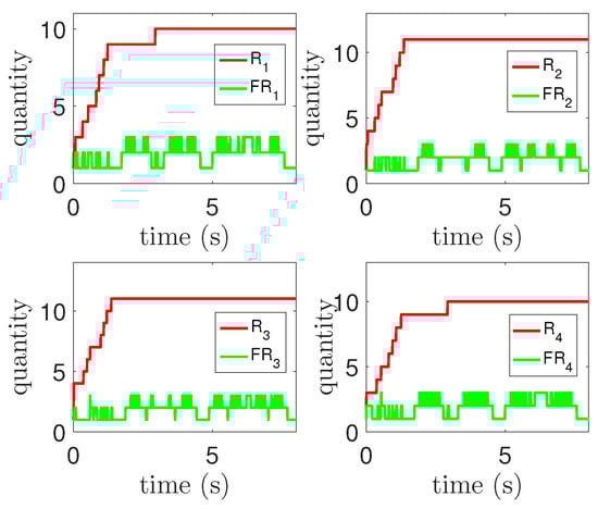 The self-organizing algorithm mainly aims at the problem of limited input caused by network presets. Therefore, the growth of rules can reflect whether the self-organizing algorithm has played a role. In addition, the self-organizing algorithm includes restrictions on access to the rule base to speed up the access process. The curve with the number of rules recorded in the simulation is shown in Figure 14, where represents the total number of rules and represents the number of firing rules. It can be seen from the figure that the number of rules keeps growing over time and eventually tends to be stable. This result shows that when the existing rules cannot meet the threshold conditions, new rules are generated to correspond to them. With the stability of the tracking process, the number of rules tends to be stable. In addition, the number of firing rules is less than the total number of rules, which indicates that the restriction on rule access in the self-organizing algorithm can speed up the calculation process of output to a certain extent.