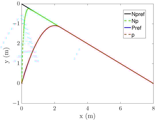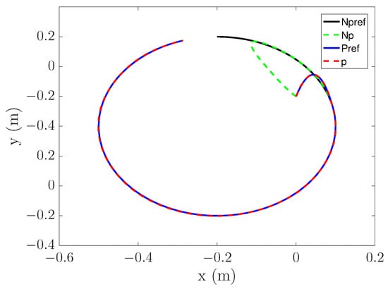The tracking process is shown in Figure 15 and Figure 16, where represents the reference trajectory without PS, represents the tracking curve without PS, represents the reference trajectory with PS, and p represents the tracking curve with PS.