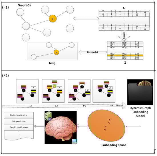 Hamilton et al. [74] presented an encoder–decoder framework for static graph embedding learning (see, e.g., Figure 1 ()). The model learns a low-dimensional vector (also known as an encoder) that can be utilized for any downstream task, such as node classification, link prediction, and graph reconstruction. The decoder model is used to perform various downstream tasks; it could be a simple sigmoid function, a traditional machine learning algorithm, or a deep neural network. There are many methods available to learn these low-dimensional vectors [75].