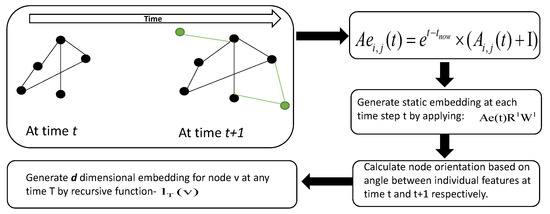 At every time step t from the training set, we generate a d-dimensional feature vector for every node (, where is the number of nodes in G), by applying the following operations. We assume that in the temporal graph domain, the embeddings of two graphs and are carried out individually; hence, it is not guaranteed that the node embeddings will remain the same even if the graphs are similar over the time points and . Therefore, we generate static embeddings independently for each time step. For a given time t, the temporal adjacency matrix is represented as (which can be weighted), and the temporal influence matrix, , can be formulated as