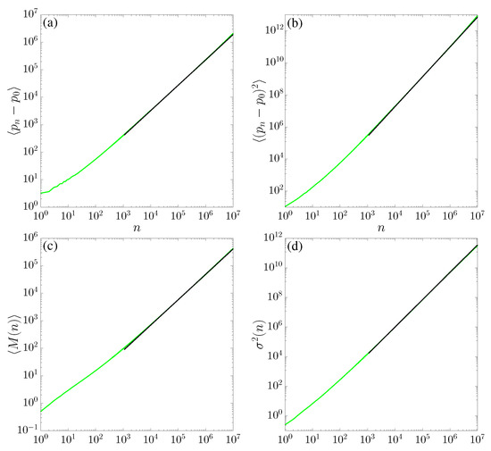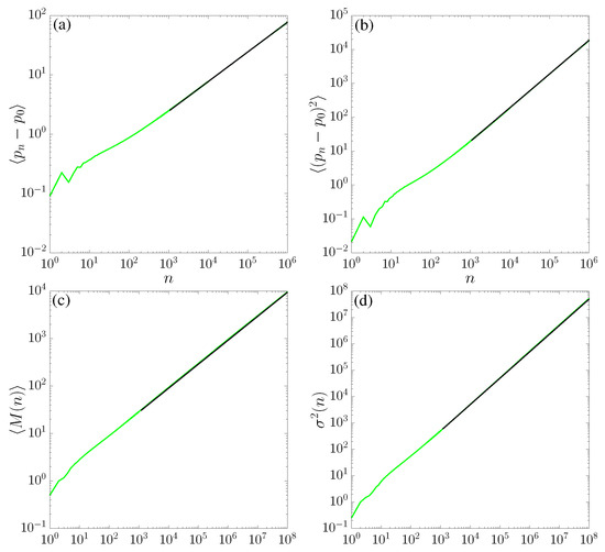 Numerical results on records statistics are reported in Figure 4 (for the SM) and Figure 5 (for the TM), panels (c) and (d) for the average number of records and variance , respectively. For the SM, our results plotted in Figure 4 are consistent with early investigations [51,52] and with the asymptotic behavior of a random walk: our fits are in excellent agreement with and , respectively. For the TM, we observe anomalous scaling with regard to (15) and (16), as plotted in Figure 5: the behavior is related to the transport properties in the sense that data are consistent with the growths.