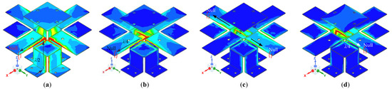 The simulated current distributions on the radiation copper patch surfaces at 1.7, 2.4, 3.1, and 3.7 GHz are shown in Figure 3. The four patches on the top are working in the same manner as electric dipoles. The L-shape patch and the top patch construct a special structure and work similarly to an open loop; by doing so they form the magnetic dipoles together. The combination of symmetrical magnetoelectric dipoles makes the element obtain dual polarization characteristics. From Figure 3a, the length of the effective current path should be ey + mz + my + p = 85 mm at 1.7 GHz, which is about half of the free space wavelength (0.48λ0) corresponding to this frequency point. In other words, the actual radiation unit is composed of a horizontal radiation patch, an L-shaped vertical radiation patch, and a parasitic patch. From Figure 3b, the length of the effective current path should be ey = 30 mm at 2.4 GHz, which is about 1/4 (0.24λ0) of the free space wavelength corresponding to this frequency point. According to the above analysis and the simulation results in Figure 3, the maximum current distribution at 1.7 and 2.4 GHz appear on the vertical and horizontal plane, respectively. Therefore, the antenna element at the low-frequency points is similar to the traditional magnetoelectric dipole. At 3.1 and 3.7 GHz, the nulls appear near the end of the horizontal patch and the current distributions on the vertical plates are irregular. It can be seen that the magnetoelectric dipole antenna unit at the high-frequency points works in the high-order mode, and the calculation results are close to the simulation results, as shown in Figure 3.