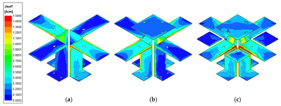 The simulated maximum surface current distributions of three different antennas at 1.7 GHz. (a) Case 1. (b) Case 2. (c) Case 3. The unit of surface current is A/m.