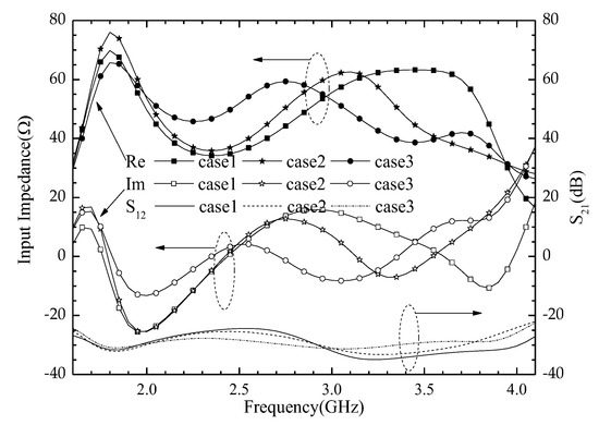 The simulated input impedance and S21 of the three cases are shown in Figure 7. Both the real and imaginary parts of Case 3 are more stable than the other two cases by using the proposed geometry. The three lines without symbols at the bottom of Figure 7 are simulated S21. It is clear that the proposed antenna with good isolation is between ports 1 and 2, and there is less than −27 dB in the whole operating frequency band.