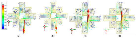 The simulated current distribution of the radiation and parasitic patches at 1.7 GHz. (a) t = 0, (b) t = T/4, (c) t = T/2, (d) t = 3T/4.