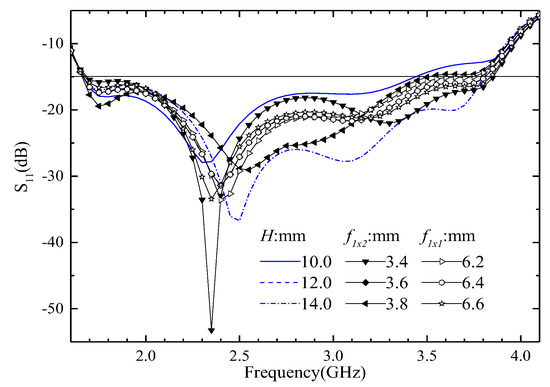 The simulated S11 when the size of feeder 1 width (f1x1, f1x2), or distance between director and electric dipoles (H) is changed.