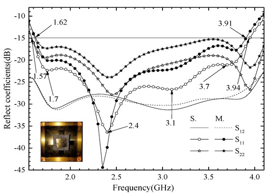 The photo of the fabricated prototype of the proposed antenna array is shown in Figure 15. The antenna elements in the presented antenna array seem to be twisted slightly for a few degrees, due to the parasitic copper sheets being clamped between the upper and lower plastic fasteners and installed on the antenna unit. The plastic fasteners made by 3D printing technology are only 0.5 mm thick, therefore, the rigidity of the plastic support is limited, making its surface not flat, and causing some distortion of the antenna unit. The comparison between the measured data and the simulation data in the following section shows that the radiation characteristics of the antenna array will not change significantly due to this deformation. From another point of view, this antenna array structure has high robustness. The antenna array is composed of four ME antenna units, and the spacing between two adjacent units is 0.594λ0 (110 mm). The measured reflect coefficients and gain are shown in Figure 16. Both the S11 and S22 cover the 1.65–3.97 GHz, fractional bandwidth is 82.7%, and this matches our design goals very well, as mentioned above. The measured S21 is less than −30 dB in the entire operating frequency band, due to the optimized spacing between adjacent units. The measured and simulated normalized radiation patterns of the antenna array at 1.7, 2.4, 3.2, and 3.7 GHz are shown in Figure 17. The FBR is greater than 20 dB at 1.7 GHz, and is greater than 25 dB at 2.4, 3.2, and 3.7 GHz. In addition, the radiation patterns of the proposed antenna array have good symmetry in the whole operating frequency band. For phi = 0°, the HPBWs are 66.6°, 65.6°, 59.8°, and 64.6° at 1.7, 2.4, 3.2, and 3.7 GHz, respectively. For phi = 90°, the HPBWs are 19.4°, 14.2°, 11.1°, and 9.4° at 1.7, 2.4, 3.2, and 3.7 GHz, respectively. The co-polarization is 25 dB larger than the cross-polarization in the entire operating frequency band.