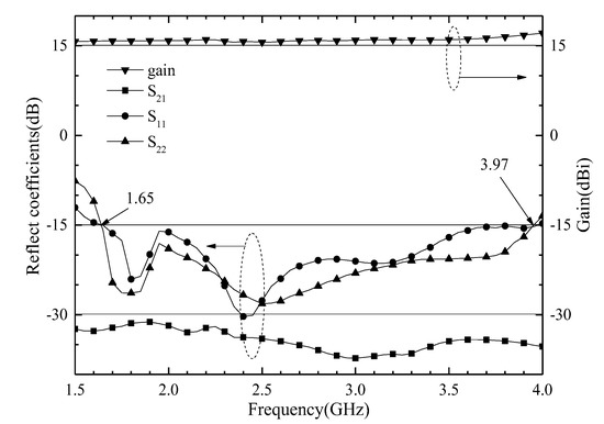 Case 3: The VSWR is less than 1.5 from 1.6 to 3.9 GHz, its impedance bandwidth covers the design goals very well, and its gain is more stable. The variation range of gain is 0.7 dB in the 1.71–2.69 GHz frequency band, and 1.0 dB in the 3.3–3.6 GHz frequency band, respectively.