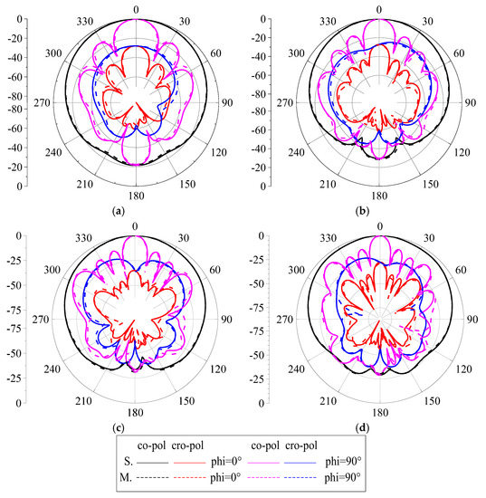 Simulated and measured radiation patterns of the proposed unit. (a) 1.7 GHz. (b) 2.4 GHz. (c) 3.2 GHz. (d) 3.7 GHz.