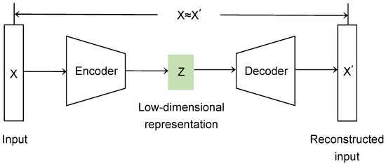 Instance selection aims to decide which instances in the training set should be retained for further use during the learning process [21,22]. By instance selection, the training set is reduced, which helps to reduce the running time during the training process. Applying the idea of instance selection to the model extraction attack effectively alleviates the problem of query overload. For our image classification task, the image data are first dimensionally reduced by an autoencoder [23,24,25], then clustered, and finally selected from the clustered data using a carefully designed algorithm to minimize duplicate or similar data and improve query efficiency. The structure of the autoencoder is shown in Figure 2.