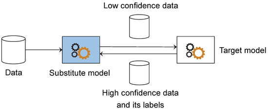 Note that, after classification by the substitute model, the high-confidence data are not labeled by the target model and cannot participate in the later supervised training. However, these data are still valuable for use. We hope the substitute model can continue to learn from this part of the data and improve its performance of the model, so we still train the substitute model with high-confidence data. We treat this part of the data as unlabeled data, and consistency regularization in semi-supervised learning is introduced and adapted [28,29]. Consistency regularization is designed to use the unlabeled data to train the model fully.