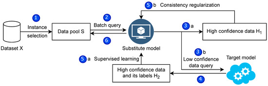 Attack framework. (1) The data we collected will be processed, and some samples will be selected using instance selection. (2) The training process will be divided into multiple substitution epochs. In each substitution epoch, a part of the data are extracted for the substitution model to label. In (3)a and (3)b steps, the high-confidence dataset and low-confidence dataset of the substitute models are obtained, respectively, and only the low-confidence dataset is queried for the target model. (4) leaves the high-confidence data of the target model and its labeled set. Finally, supervised learning in (5)a and consistent regularization in (5)b train the substitute models simultaneously.