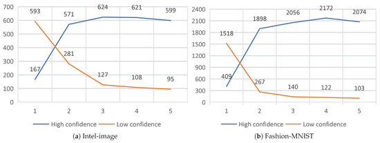 where is the most confident class and is the threshold of confidence. Equation (4) is inspired by the concept of entropy, a measure of uncertainty. It can be seen that the larger the value of Equation (4), the greater the certainty, and it thus can be used as a measure of confidence in the model’s classification. Suitable metrics from these three should be selected according to the specific task and data characteristics.