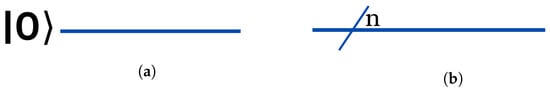 Quantum circuits are represented using circuit diagrams. These diagrams are built and read from left to right. Barenco et al. [] defined several of the basic operators that we now use in quantum circuits today. Two binary operators were added to this set by Toffoli and Fredkin [,]. We start building a quantum circuit with a line representing a circuit wire. As seen in Figure 1a, on the left side of the wire, a ket indicates its original condition of state preparation.