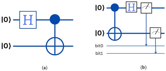 Although there are a variety of ways to create entangled Bell states using quantum circuits, the most basic uses a computational basis as input and includes a Hadamard gate and a CNOT gate (see Figure 5a).