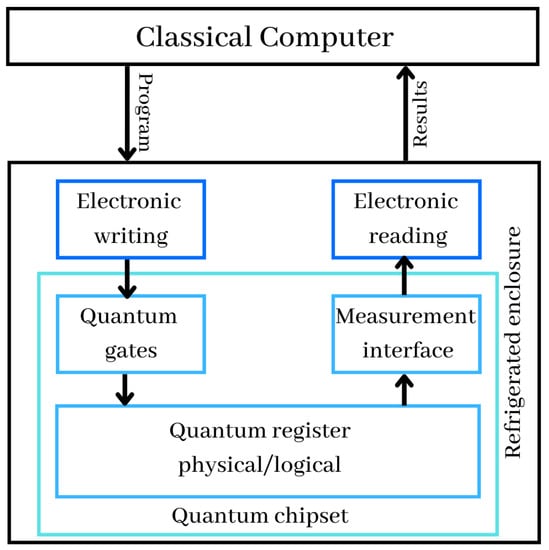 Quantum computers are processing machines that take advantage of quantum physics properties. This may be extremely beneficial for some tasks, where they can greatly outperform the most powerful supercomputers. A quantum computer can be considered as a co-processor of a traditional computer, as a GPU can be for video games or for training neural networks in deep learning. As shown in Figure 6, a traditional computer closely control computer operations by triggering at precise rates the qubit operations performed by the quantum gates. This trigger takes into consideration the execution time of the quantum gates as well as the known of the qubits, i.e., the duration for which the qubits remain in a superposition state. In addition to its classical control computer, the quantum computer includes several components, which we analyze one by one, with the details below: