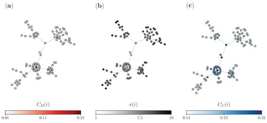 Eccentricity is a graph-theoretic metric that has been considered as a classic concept in operations research problems [31,32]. This global network measure has been proposed as a standard tool for determining whether certain functions in a network have been optimally placed. For example, when deciding on placing certain buildings in a city, we may want to take into account that those buildings should be conveniently reached, such as with fire stations or hospitals. In effect, the decision is to place them at the center, where this certain functionality will allow the facility to be within a specific range of all the other places in a network. The eccentricity is visualized in the middle panel of Figure 1. We see that i nodes with small are near the center and are colored as white, whereas nodes with larger eccentricities are far away from the center and are fully colored in darker gray. The nodes that are colored black are the periphery of the network (eccentricity equal to the diameter).