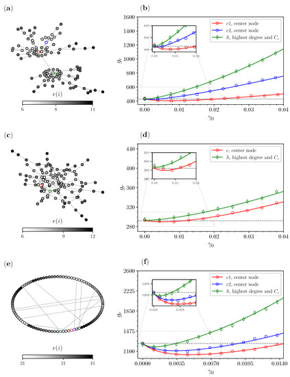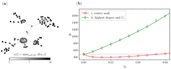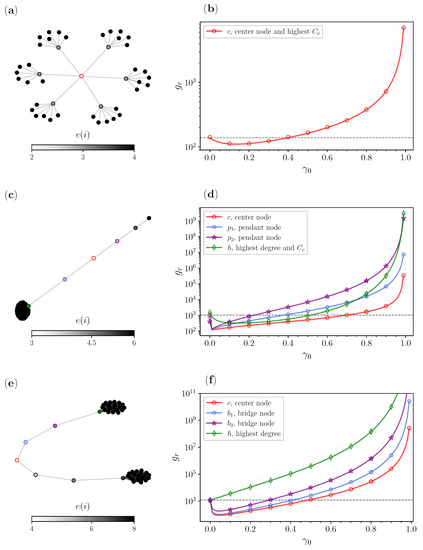 In Figure 6c,d, we analyze a lollipop graph with a bell with nodes and a path graph with nodes. Here we diverge a bit from our previous convention of picking the center nodes or the node with the highest degree, since we also consider two of the pendant nodes that are around the center c. These nodes are picked deliberately, as we wanted to show how their eccentricity plays a role. The node with the highest degree (green) is again the node with the highest closeness centrality. Then we have the center node (red), which has an eccentricity of 3 and is located right in the middle of the path graph. On top of these, here we also have two pendant nodes (blue), located between the center and the hub, and the (purple) node, right after the center node. Here we have a small improvement for the hub, but for the other three candidates, the improvements look similar at the beginning but diverge from one another for larger resetting probabilities . We can see from Table 2 that the largest improvement for occurs when we reset to the center, then for , then , which are all in agreement with the eccentricity values of the nodes. For the center, since it is the best node, even larger values for do not worsen the results that fast, while for the pendant node behind it, right after the optimal reset rate we have a significant increase in .