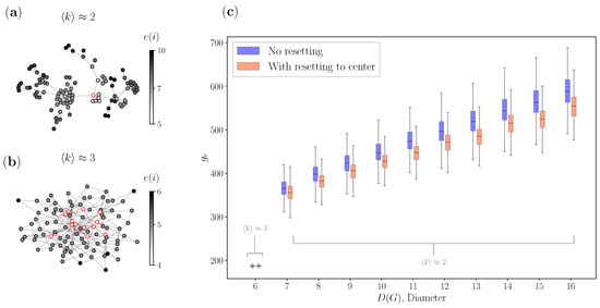 On top of the fact that this and previous findings confirm that stochastic resetting minimizes the global search time to some extent, here we also address exactly which networks can profit from the centrality-based resetting approach. To our knowledge, this has not yet been explored. We therefore ask the following question: how can one relate network structure properties such as the connectivity and eccentricity of a given network with the gain of using a specific to implement a stochastic resetting strategy on that network? In the preceding section, we introduced the concept of eccentricity and the diameter , the longest shortest path. Here, we additionally introduce the connectivity, which is expressed using the average node degree of the network. Having introduced both concepts, in Figure 3 we explored their relationship with the proposed centrality-based stochastic resetting. Firstly, in Figure 3a we see a BA network that has , one center, and a maximal eccentricity (diameter) of 10. Secondly, in Figure 3b we see another BA network, but here , such that the network has significantly more centers and has a maximal eccentricity (diameter) of 6. Although the networks have fundamentally the same BA topology, the increase of the average node degree for a notch has resulted in two completely different networks in terms of structure. The network with more edges (higher average node degree) has shrunk in diameter and has a higher density, whilst the networks with few edges are sporadic. Lastly, in Figure 3c we show the relationship between , and the GMFPT for a large sample of BA networks. On the horizontal axis, we have different values for the diameters , where each box plot corresponds to a value of the diameter, and it is filled using independently generated networks that all have that same diameter. Blue box plots show without resetting, while the red box plots show times for resetting using the centrality-based approach for all networks. On the vertical axis, we plot for each network, where r is calculated for the “best” center for both approaches, with and without resetting. Going back to operations research and graph theory literature, both have addressed that one of the centers is the solution for the facility location problem [31]. If there were 10 centers as in Figure 3b, we consider the “best” center to be the one that has the smallest minimized , meaning we calculate for all the centers and pick the smallest. From Figure 3c, we can directly see that BA networks can have a wide range of diameter values when the networks have a smaller average node degree. For , we have diameter values from 7 to 16, while for , for all of the generated networks, we only have a diameter of 6. On top of that, we clearly see that for (the lowest diameter value of 6), there is visibly no minimization of the GMFPT for all of the generated networks. The results are consistent with previous findings in the literature [62]: having a compact, strongly connected network has been shown to result in more beneficial nodes, since information is spreading faster. According to this finding, when the diameter of the network is small, there are many centers and the density of the network itself facilitates a faster flow of information, for which essentially no resetting is needed.