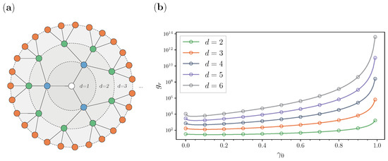 In Figure 5, we analyze the centrality-based stochastic resetting approach on balanced trees with the same branching factor but different depths. The branching factor is set to , while we change the depth d from 2 to 6. Trees have a rather trivial center, which is the root from which all the branching starts (). We see from Figure 5a that the depth is basically the radius, since the root is on a maximal distance of the depth to all nodes. The results for the GMFPT in Figure 5b are calculated results when r is set to be the root. These findings show that as the depth of the tree increases, becomes naturally larger, making the search from the root to all the other nodes more extensive. Due to these large values that we see as the depth increases, to appreciate the advantage of the central resetting strategy, we supplement this figure with Table 1. The table shows that as the depth increases, the balanced tree algorithm generates a tree with more nodes and a bigger diameter. The last column is similar to the previous comparisons for improvement, where we list the percentage of improvement for the optimal resetting probability for which the GMFPT from the root to all the other target nodes is the smallest. This finding is consistent with the earlier diameter analysis for the scale-free networks from Figure 3. Hence, we again see that as the diameter increases, the stochastic resetting approach to the center improves the search substantially.