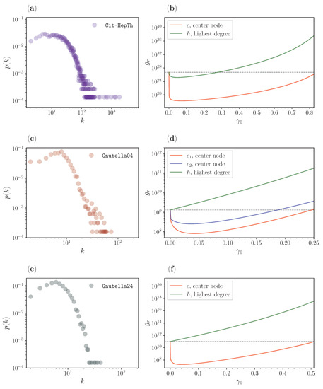 In Figure 7c,f, we analyze two snapshots of the Gnutella peer-to-peer network. The first snapshot is for 4 August 2002, presented in c and d. We see that, similarly to the citation graph, this network also has a degree distribution that approximately follows a power-law, reflecting some scale-free property. Here, we show a comparison of three nodes: two centers (red and blue), and the biggest hub (green). We see a similar ranking results as in the one for the candidates of Figure 4a,b. For the center, we have a significant drop, i.e., a minimization of , while resetting and starting the search from the hub would not lead to an improvement of . The second snapshot is from 24 August and is presented in e and f. Again, the degree distribution follows a power-law, although this power-law exponent is a bit larger [70,71] than the one for the scale-free property. We also have two candidates, the center (red) and the biggest hub (green). While there is no improvement for the hub, the resetting to the center again demonstrates the advantage of the centrality-based stochastic resetting. Analogous to the citation graph, the network topology indicates a modular organization expressed by its center. Central resetting improves the search to all the other nodes.