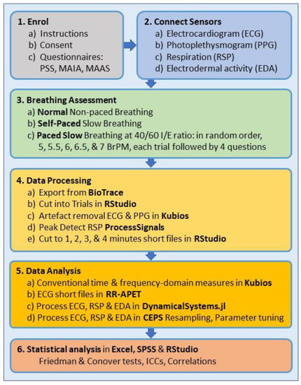In order to demonstrate the utility of CEPS, this paper presents a subset of data taken from a larger on-going study and focuses on conventional and entropy measures of HRV derived from electrocardiogram (ECG) and respiration data. Figure 1 provides an outline schematic of the protocol.