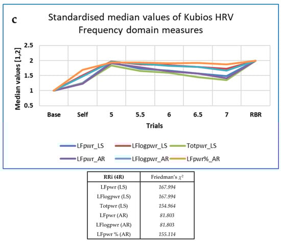 When conducting a resonant breathing assessment (RBA), a therapist will take into consideration a number of subjective and objective measures, including the participant’s comfort and compliance at a particular breading rate, as well as their ability to breath at the slower rates without any hyperventilation symptoms, such as light-headedness, dizziness or feeling that the heart is pounding. Lehrer et al. [58] have outlined the RBA protocol developed in their clinic and Shaffer and Meehan [57] have also codified the RBA protocol and recommend considering six HRV measures for the purpose of selecting the resonance breathing rate (RBR). We have endeavoured to replicate the Shaffer and Meehan [57] protocol in the current study, using the following measures: (1) Low Frequency (LF, (0.04–0.15 Hz) Absolute Band Power, in units of ms2 (LFBP); (2) power of the LF Spectral peak, in units of ms2 (peak low frequency power, or PLFP); (3) normalised LF HRV, in normalised units (nu); (4) peak-to-trough difference in heart rate (HR), or ‘HRMaxMin’ (in beats per minute); (5) Phase Relationship of HR to Respiration rate (in degrees); and (6) comfort level. Shaffer and Meehan [57] also discussed how to select the RBR and how to ‘Break Ties’ when different breathing rates score maximally on different measures. This does, however, require a degree of clinical judgement.