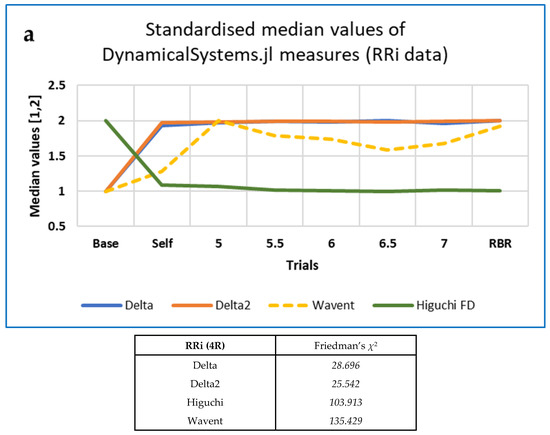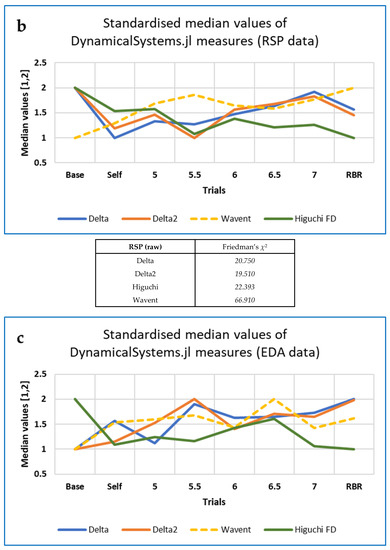 Here, as adumbrated in our earlier paper, we have extended this analysis in a second repeated-measures study, comparing measures for baseline, self-paced breathing and breathing paced at five different rates, not just one, and for a larger cohort (N = 44). We have also analysed how measures change with data length, and which are appropriate for data segments shorter than the five minute recordings usual in short-term heart rate variability (HRV) studies. Instead of using PPG data, we also explored tonic (slowly changing) electrodermal activity (EDA). In addition, after further literature review, there are now many more measures available in CEPS than when it was first published (currently more than 70 as against 10 complexity measures originally, and around 50 entropies). We have applied several of them here, focusing on other fractal dimensions in addition to FD_H (CEPS now includes some 22 FDs) and heart rate asymmetry (five ‘classical’ HRA measures and 11 derived from Poincaré plots). In addition, five measures from DynamicalSystems.jl are included in our analysis. As well as the introduction of many more measures, other changes to CEPS since its first version include the ability to modify data (normalisation, binarisation, interpolation, coarse-graining, addition of coloured and other noises, data segmentation with or without overlapping windows, resampling and detrending), as well as an analysis section for displaying plots and results from multidimensional or graphical measures (currently only two [8,9]. Other measures also in course of implementation include diffusion entropy [10,11], Emergence, Self-Organization and Complexity [12]. At the end of the article, we have included a list of the more than 200 abbreviations used.
