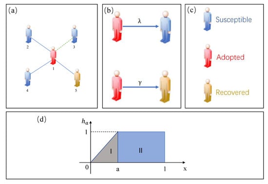 (a) A schematic diagram of information spreading in a single-layer complex network. Individual 1 is in the adopted state; individuals 2, 3, and 4 are in the susceptible state; and individual 5 is in the recovered state. The blue solid line indicates that the information is still in the state not propagated from this path; the green dashed line indicates that at the current time, the adopted state has passed information to its neighbors through this path. (b) Illustrates the probability of information passing from the A-state to the S-state and the probability of the A-state becoming the R-state. (c) Illustrates that each color corresponds to a different state. (d) Illustrates a probabilistic graphical representation of passionate psychology behavior. In area I, when , the adoption probability rises with x.In area II, when , the adoption probability no longer changes with x and remains constant.