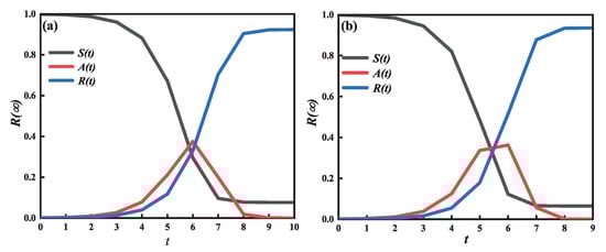 In Figure 2, we can obtain the contact capacity that can influence the evolution of the A-state and the outbreak time of information propagation. By comparing (a) and (b), we can deduce that the evolution time cost continuously reduces from 11 to 10, while , which denotes that at the same step t, the final spreading scope increases. The phenomenon demonstrates that increasing an individual’s capacity for contact (i.e., the number of contact neighbors) can hasten the dissemination of information across a single-layer network.