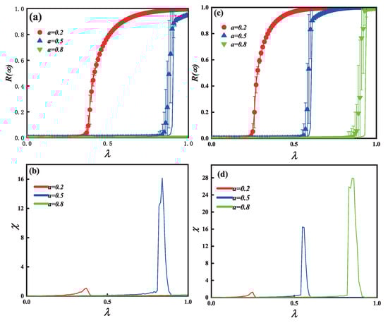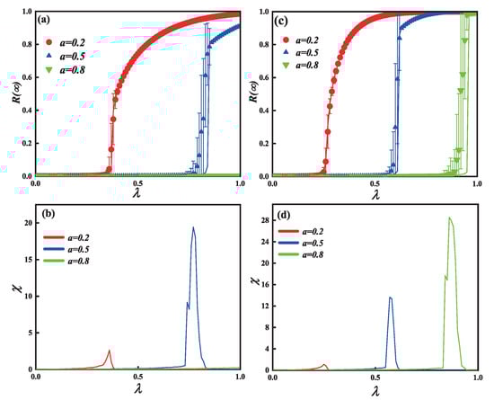 Figure 3a () and Figure 3c () show that as increases, the final spreading scope increases to global spreading. Furthermore, Figure 2a,c also show the influence of the passionate psychology parameter a on the phase transition. In subgraph (a), when an individual shows a positive passionate psychology behavior—e.g., —the pattern of shows a second-order continuous growth, suggesting that even with a small , a positive passionate psychology can promote information propagation. When , the individual shows a passive passionate psychology behavior, and also shows a first-order discontinuous growth. When , however, the spread of information does not break out. In subgraph (c), shows a second-order continuous growth at . similarly exhibits a first-order discontinuous growth at and . The phenomenon illustrates that the limited contact capacity c changes the pattern of information spreading, such as in subgraphs (a) and (c).